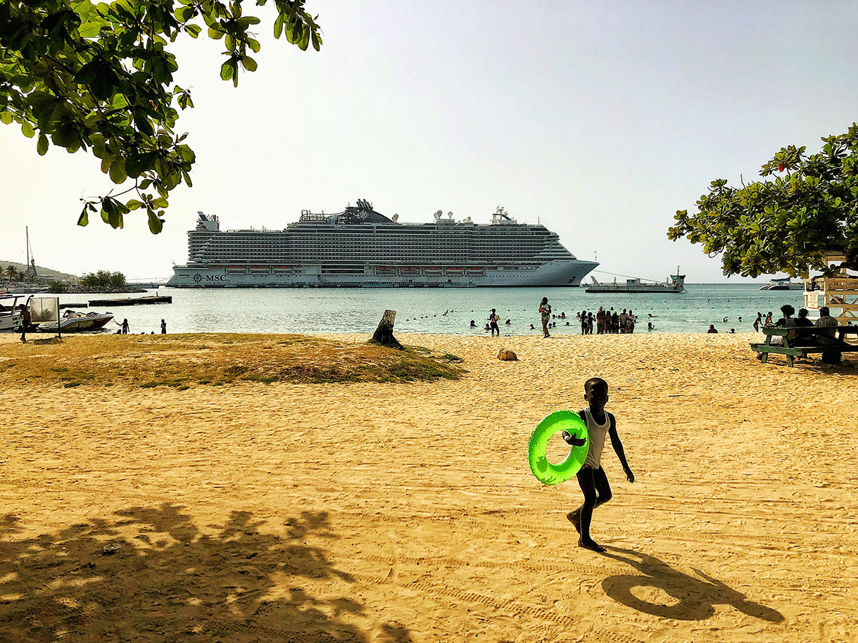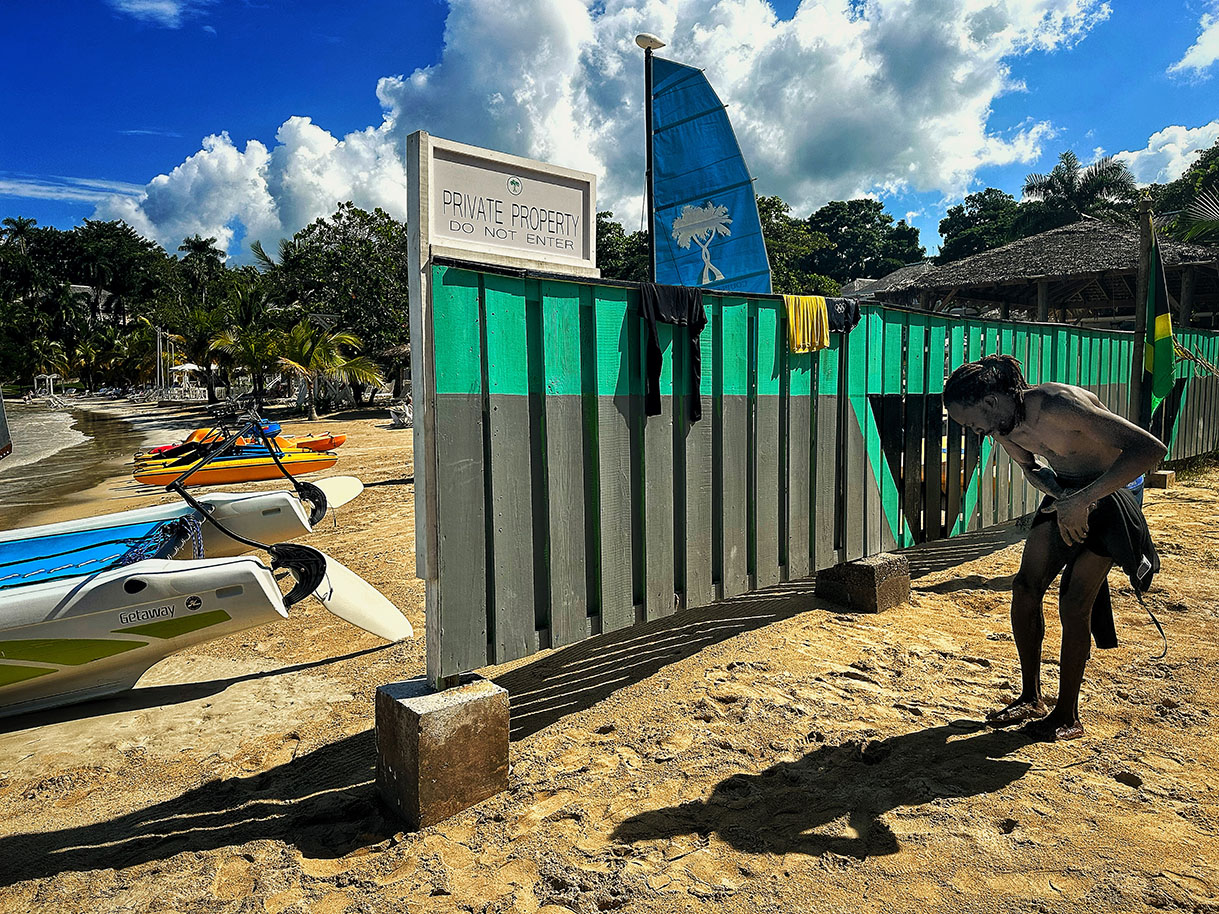 The mythos and aesthetic of Jamaican tropicality that sustains the island’s status as a popular tourist destination, however, comes at a tremendous cost. The vast majority of Jamaica’s renowned beaches are private property. The numerous all-inclusive resorts provide some degree of employment within their self-contained compounds but they stifle local business and over-consume natural resources. Meanwhile, high crime rates driven by desperate poverty continuously threaten the tourism industry islandwide.